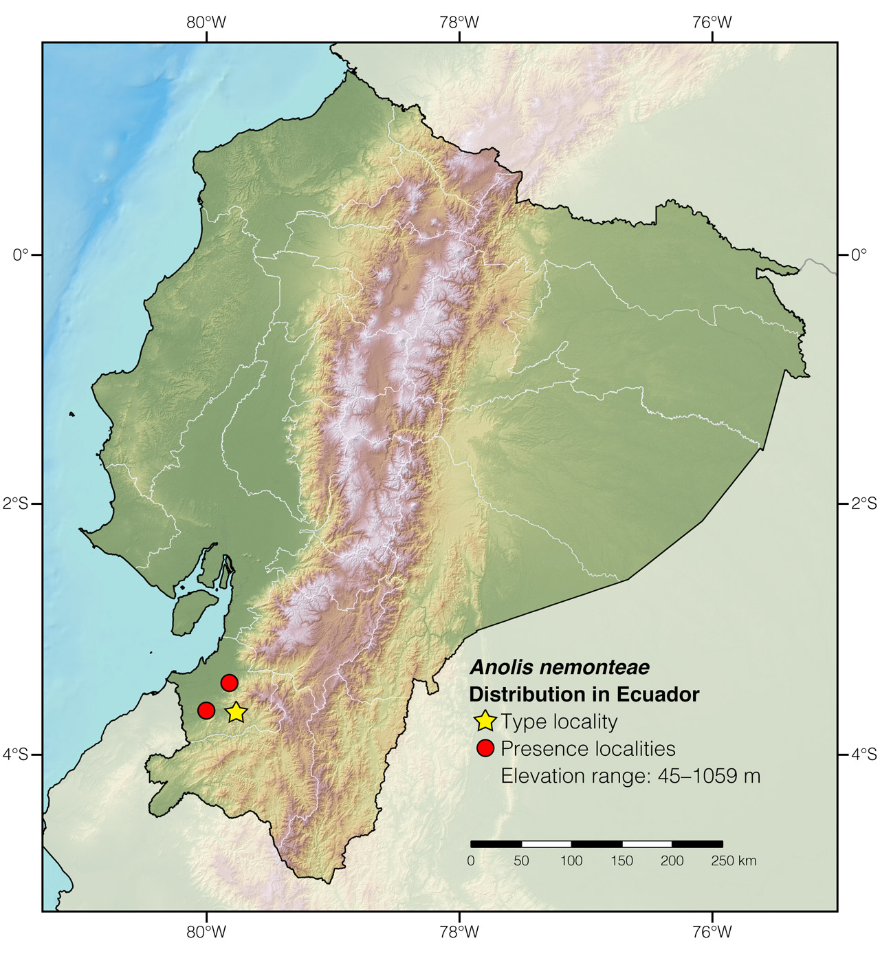 Distribution: Anolis nemonteae is endemic to an area of approximately 87 km2 along the Pacific foothills of the Andes in southwestern Ecuador (Fig. 2).