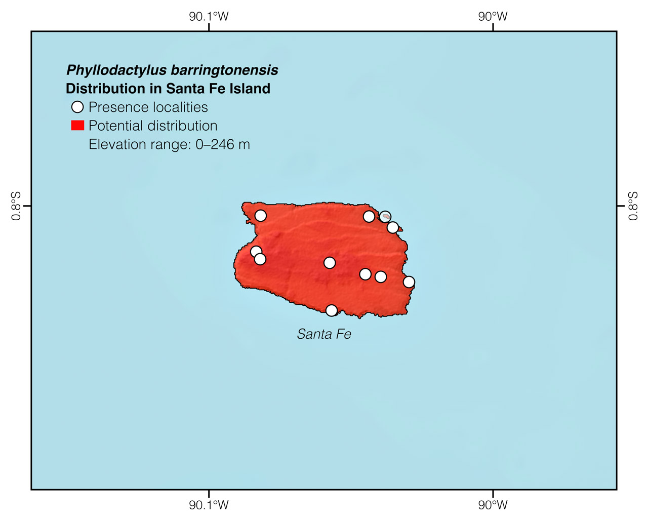 Figure 2: Distribution of Phyllodactylus barringtonensis in Galápagos. See Appendix 1 for a complete list of the presence localities included in the map.