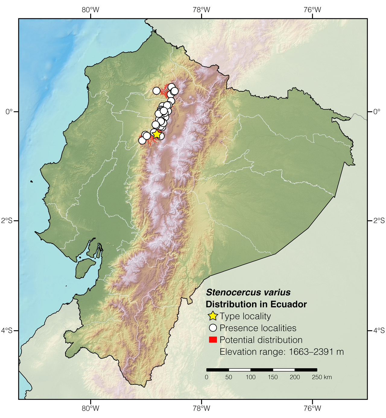 Distribution: Stenocercus varius is endemic to an area of approximately 2,395 km2 along the Pacific slopes of the Andes of northwestern Ecuador (Fig. 2).